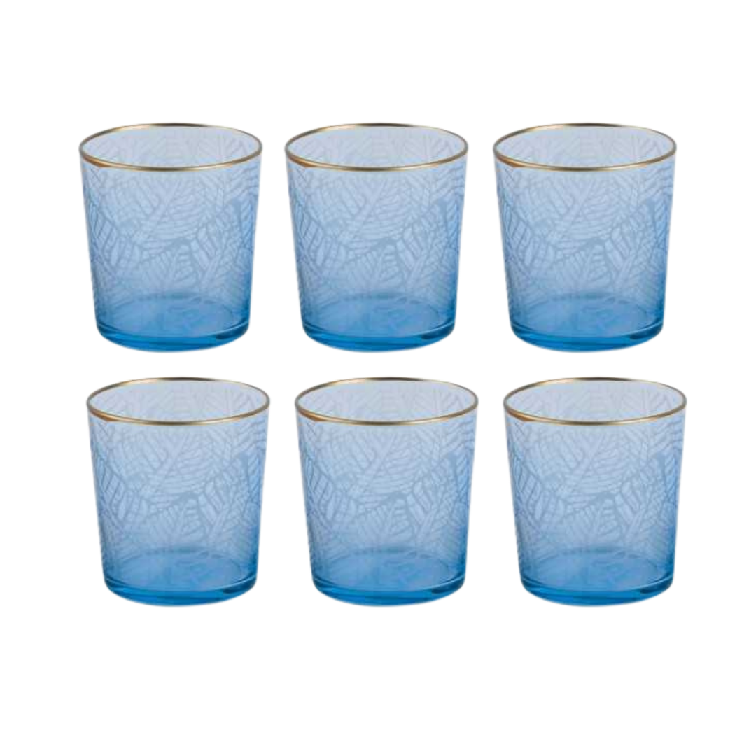 PACK DE 6 VERRES A JUS/EAU EN BLEU, DESGIN FEUILLES EXOTIQUES .
