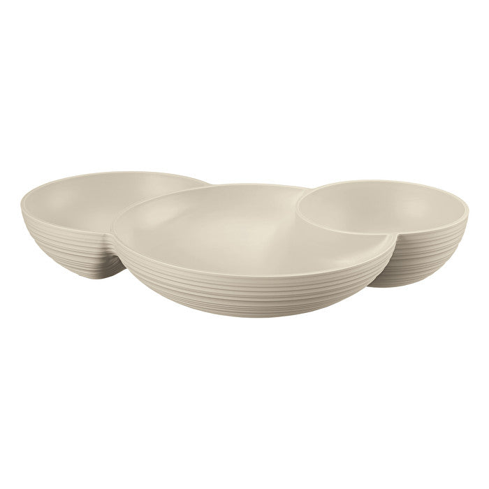 Le plat à hors d'Oeuvre est divisée en trois compartiments pouvant accueillir des cacahuètes, des olives, des légumes frais coupés en julienne ou des cubes appétissants de fromage. Ses formes sinueuses et captivantes sont un gage de fonctionnalité. Réalisé en recyclant 8 bouteilles d'eau jetables 100% post-consommation.