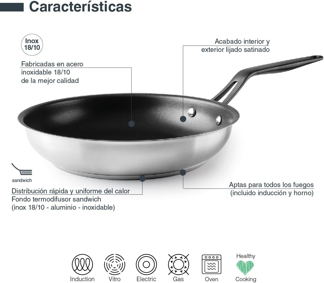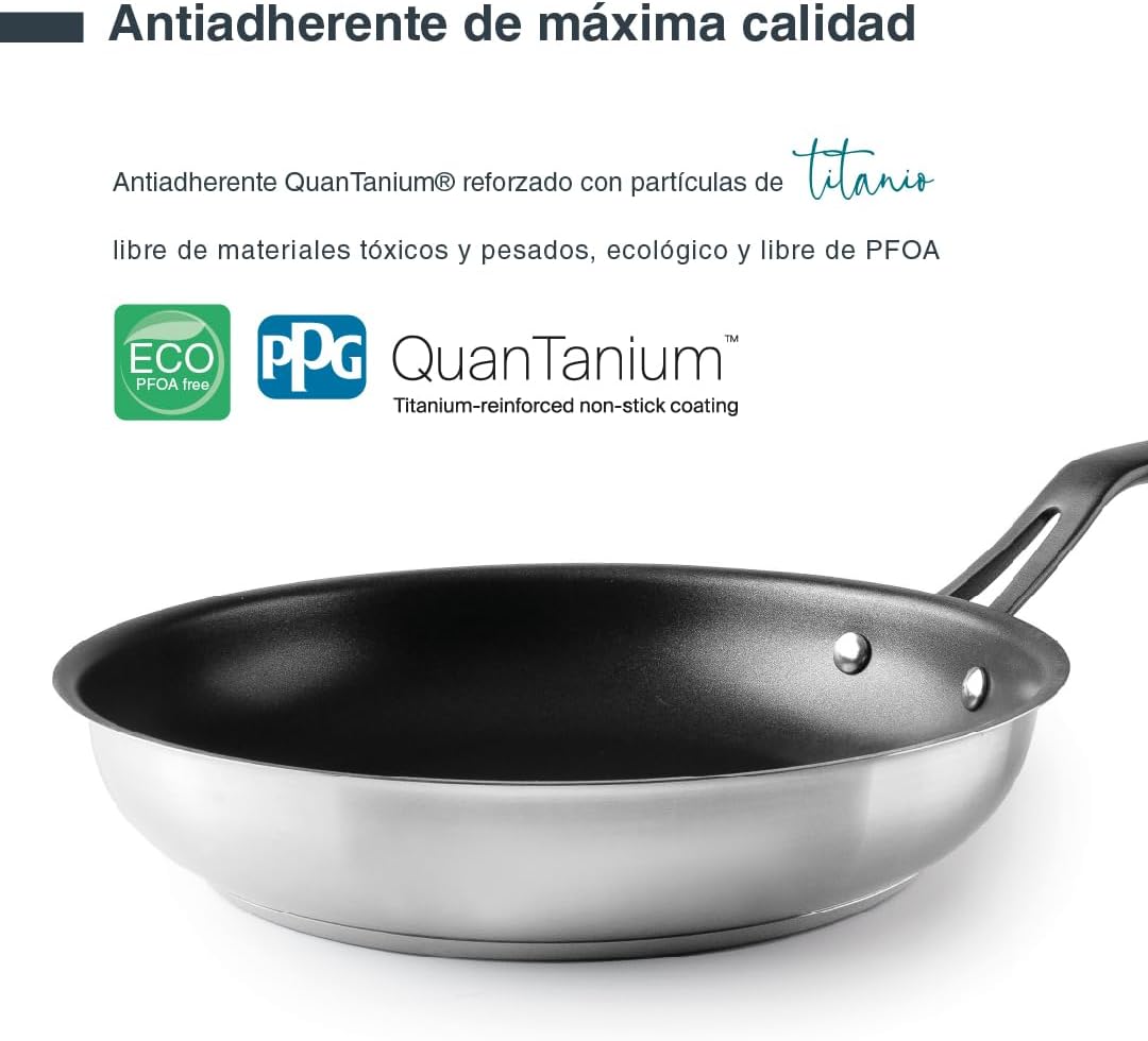 LACOR - 474240- Sartén Antiadherente Origin, Acero Inoxidable 18/10, Antiadherente QuanTanium®, Libre de PFO, Fondo Termodifusor Sandwich, Lavado a Mano, Apto Inducción, Apto para Horno, Ø20cm