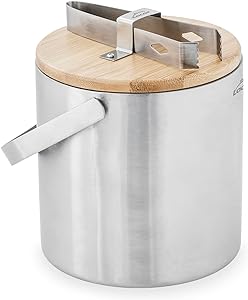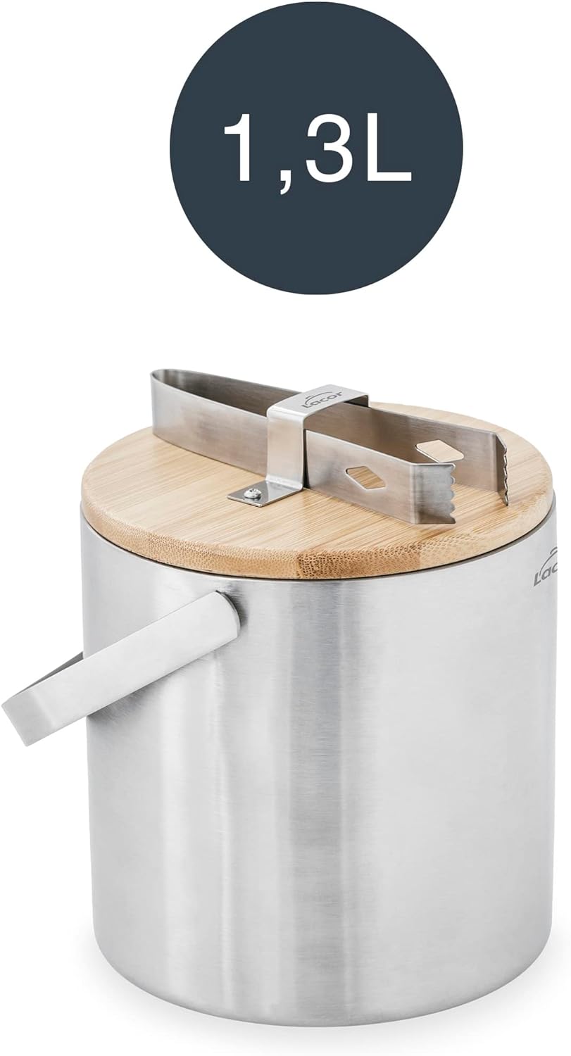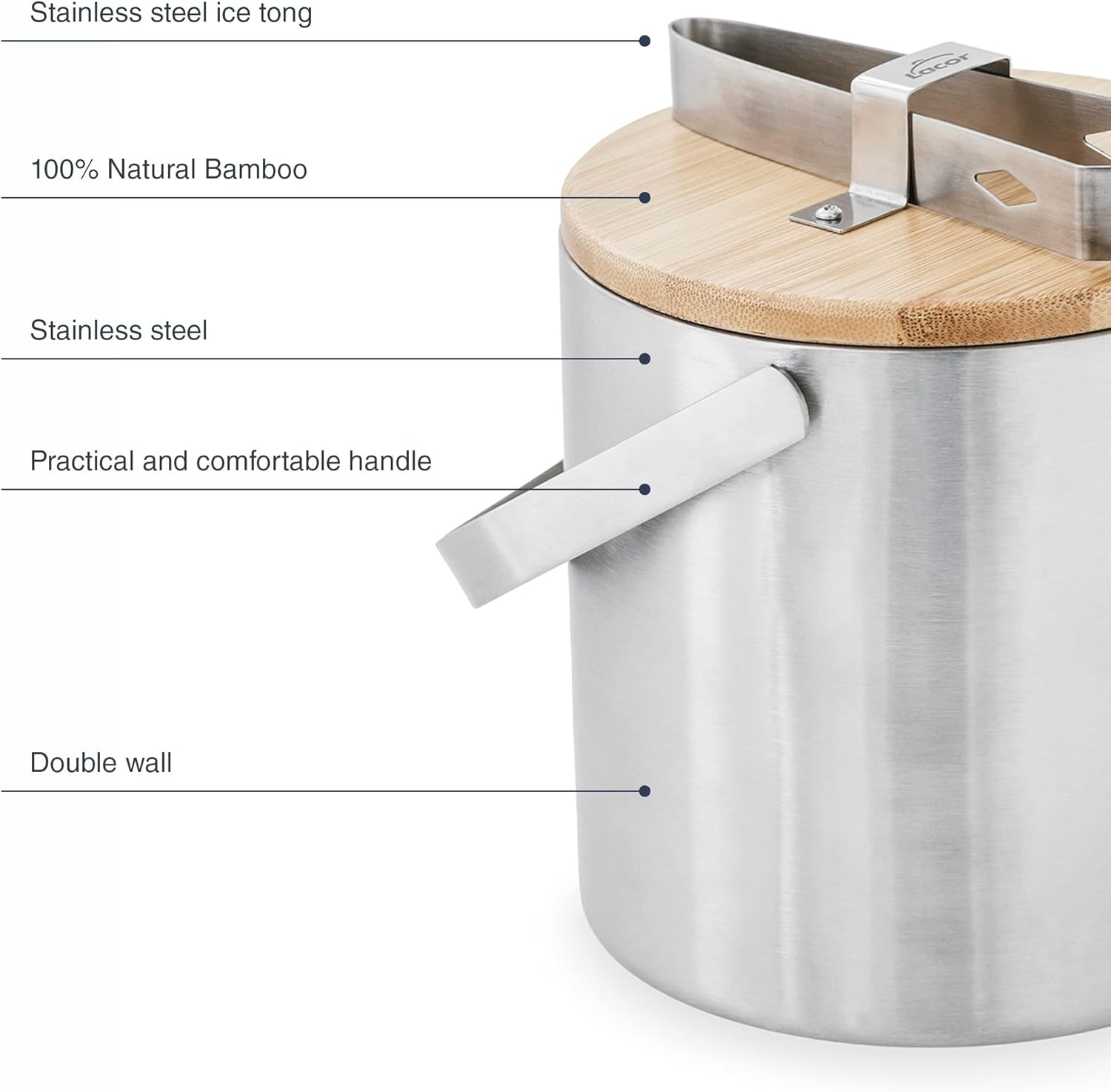 Seau à glace NORDIC, Conteneur à glace, acier inoxydable, isolation double paroi, comprend plateau en bambou 100% naturel et pince en acier inoxydable 18/10, 14 cm, Capacité: 1,3 L