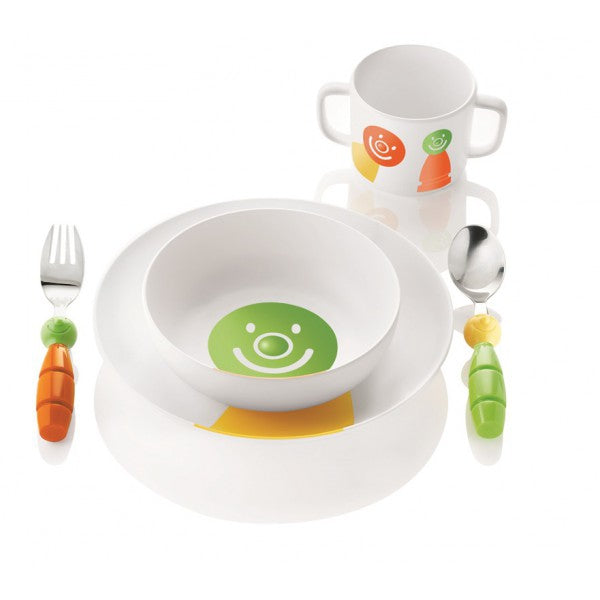 Cet ensemble coloré plaira à coup sûr à vos enfants !, Ce set en plastique et acier inoxydable est composé de :
