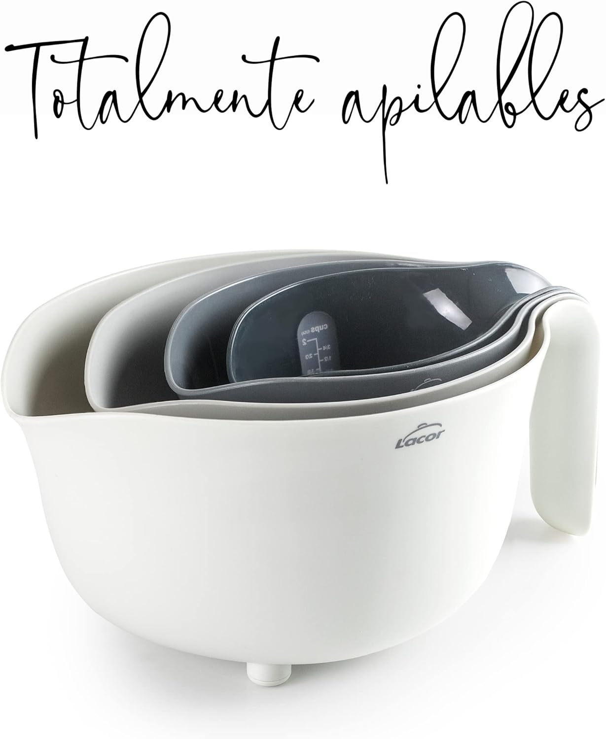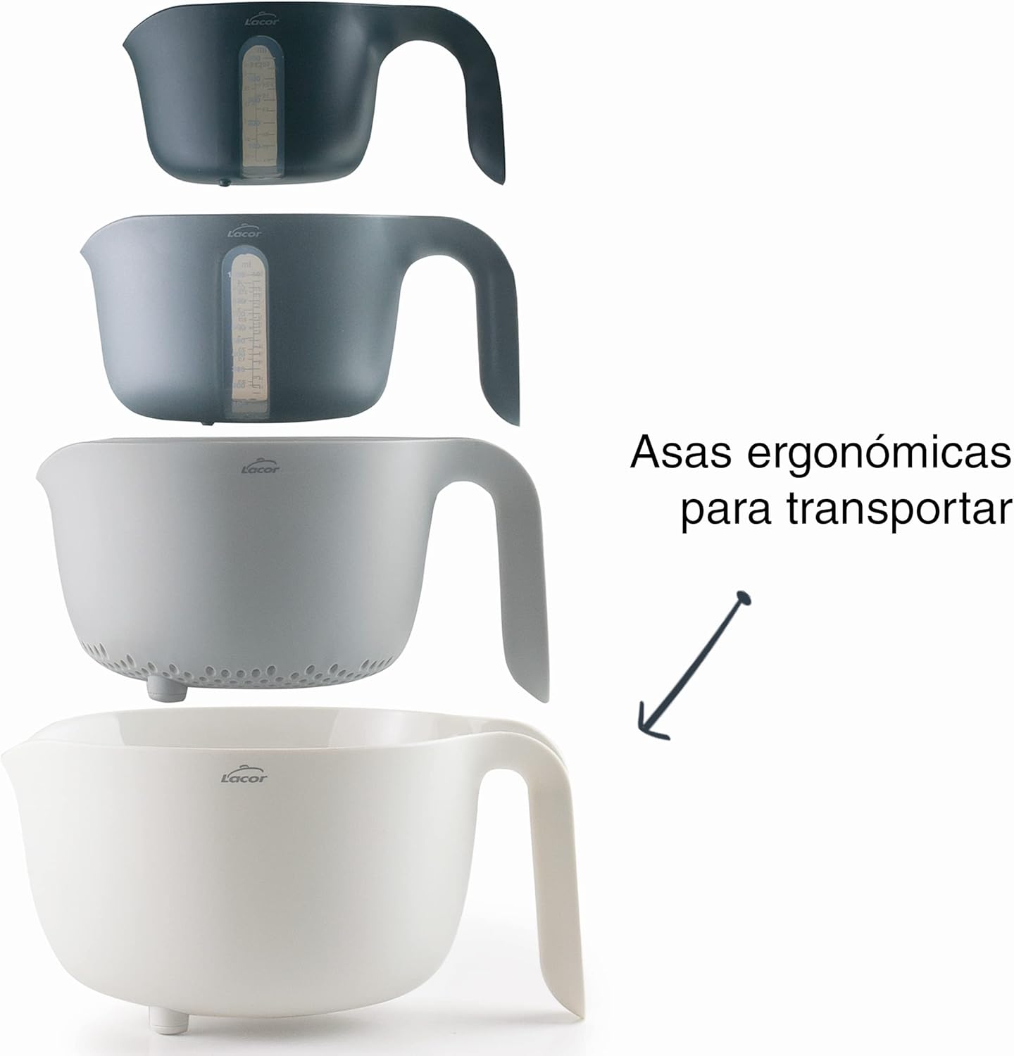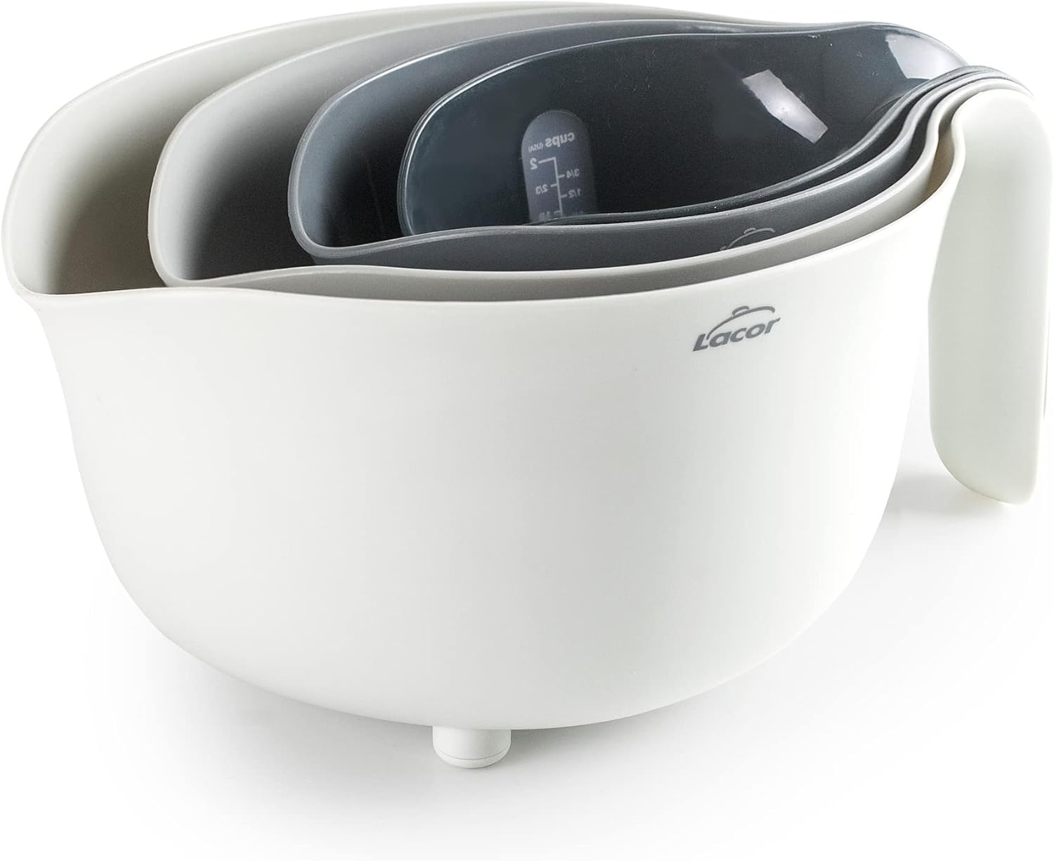 Set de 4 bols PRACTIC 100% sans BPA, bol mélangeur (3,5 L), égouttoir (2 L, 2 carafes mesurantes (1/0,5 L), empilables, adaptés au lave-vaisselle, Ø 22 x 15 cm, blanc, gris