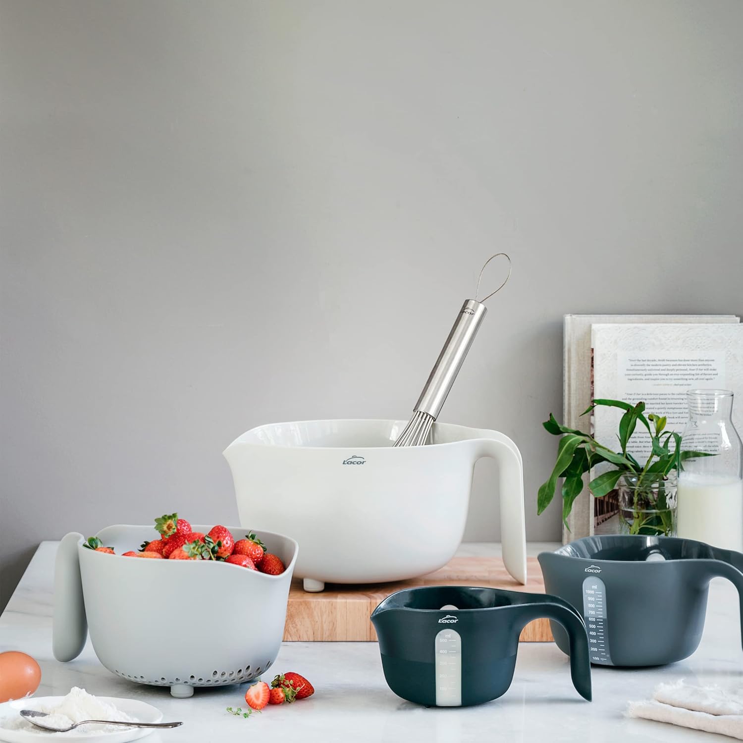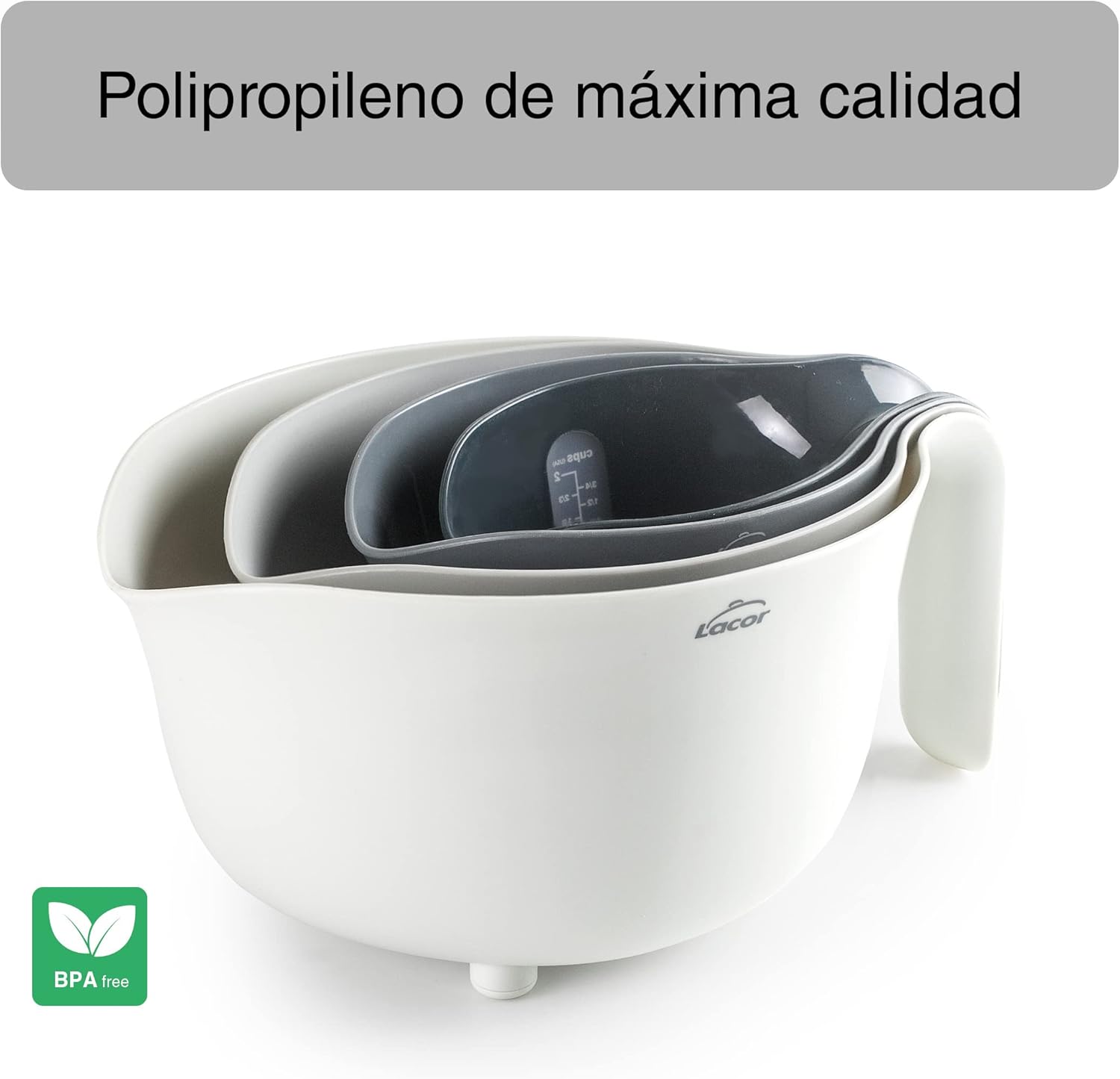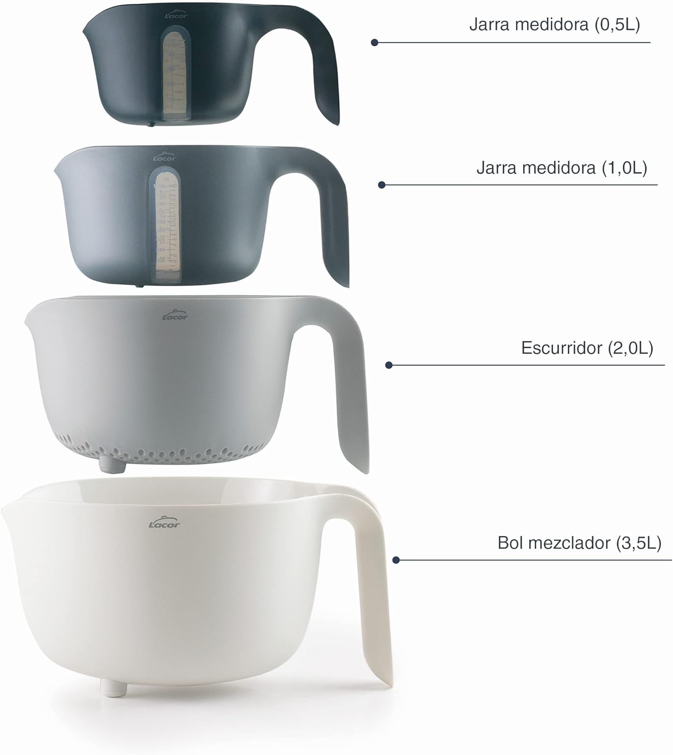 Set de 4 bols PRACTIC 100% sans BPA, bol mélangeur (3,5 L), égouttoir (2 L, 2 carafes mesurantes (1/0,5 L), empilables, adaptés au lave-vaisselle, Ø 22 x 15 cm, blanc, gris